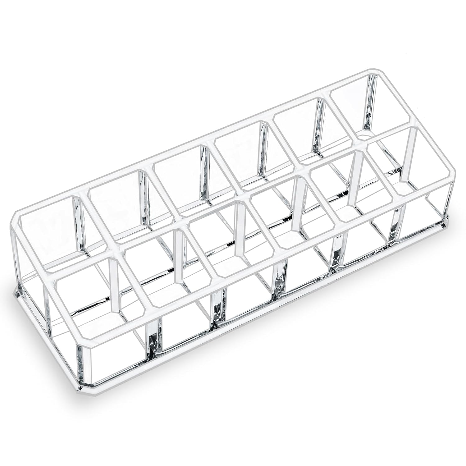 Keep your cosmetics collection organized and easily accessible with this sleek acrylic makeup organizer. Featuring 12 individual compartments, it provides dedicated spaces for lipsticks, brushes, palettes, and other beauty essentials. The transparent design lets you see contents at a glance, while the durable acrylic construction ensures long-lasting durability. Perfect for vanities, bathrooms, or dressing tables, this storage solution combines functionality with a modern aesthetic that complements any décor.