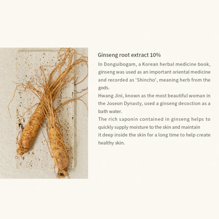 Ginseng - 10% content . This oriental herb has been known for centuries in Eastern medicine. It is also called "Shincho" which means herb of the gods. The rich content of saponins in it helps to deliver moisture to the skin and retain it for a longer time.