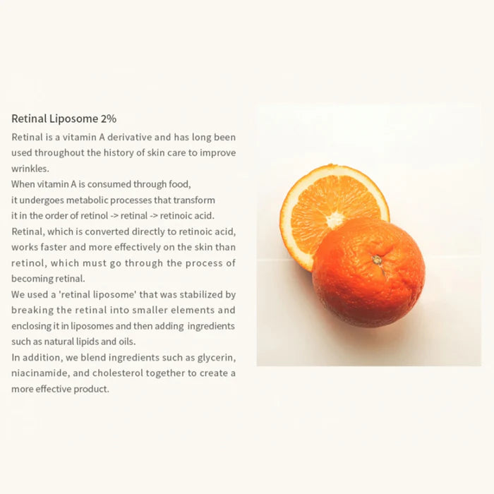 Retinal - 2% (active ingredient 0.02%) retinal, stabilized in the form of liposomes. Retinal is a vitamin A derivative that works positively in fighting wrinkles with persistence and regular use. Retinal, unlike retinol, has a faster action.