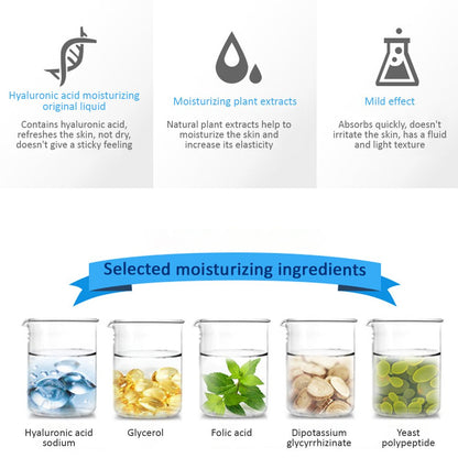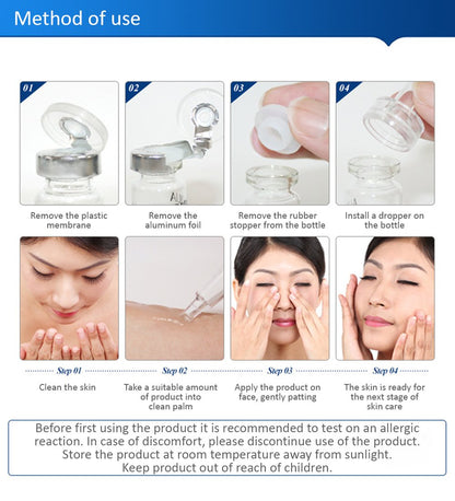 Moisturizing essence with hyaluronic acid. Moisturizing. Smoothing. Tender and smooth skin. Who doesn't want moist and tender skin? Moisture is the key to beauty. Nourishing moisture. Hyaluronic acid replenishes the skin with essential moisture, gives soft and moist skin. Gentle texture. Soft and delicate texture of essence is easily distributed on the skin and absorbs quickly. Hyaluronic acid moisturizing original liquid. Contains hyaluronic acid, refreshes the skin, not dry, doesn't give a sticky feeling. Moisturizing plant extracts. Natural plant extracts help to moisturize the skin and increase its elasticity. Mild effect. Absorbs quickly, doesn't irritate the skin, has a fluid and light texture. Selected moisturizing ingredients. Hyaluronic acid sodium. Glycerol. Folic acid. Dipotassium glycyrrhizinate. Yeast polypeptide. Moisturizing care for skin beauty. Moisturizing, smooth and beautiful skin. Replenishes reserves of moisture in the skin, reduces dry, improves the skin's moisture balance. Soft smooth and silky skin. The serum contains hyaluronic acid and nourishing plant extracts that improve skin. Gives the skin freshness and moisture. Allows you to enjoy soft, gentle and moisturized skin. The main ingredient - hyaluronic acid. Hyaluronic acid plays an important role in the beauty of the skin, nourishes, moisturizes the skin, gives softness and smoothness. Method of use: Remove the plastic membrane. Remove the aluminum foil. Remove the rubber stopper from the bottle. Install a dropper on the bottle. Clean the skin. Take a suitable amount of product into clean palm. Apply the product on face, gently patting. The skin is ready for the next stage of skin care.