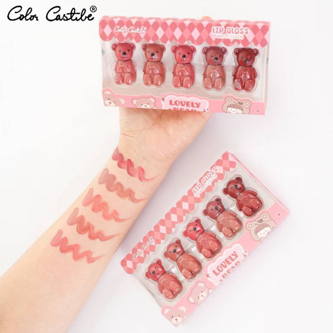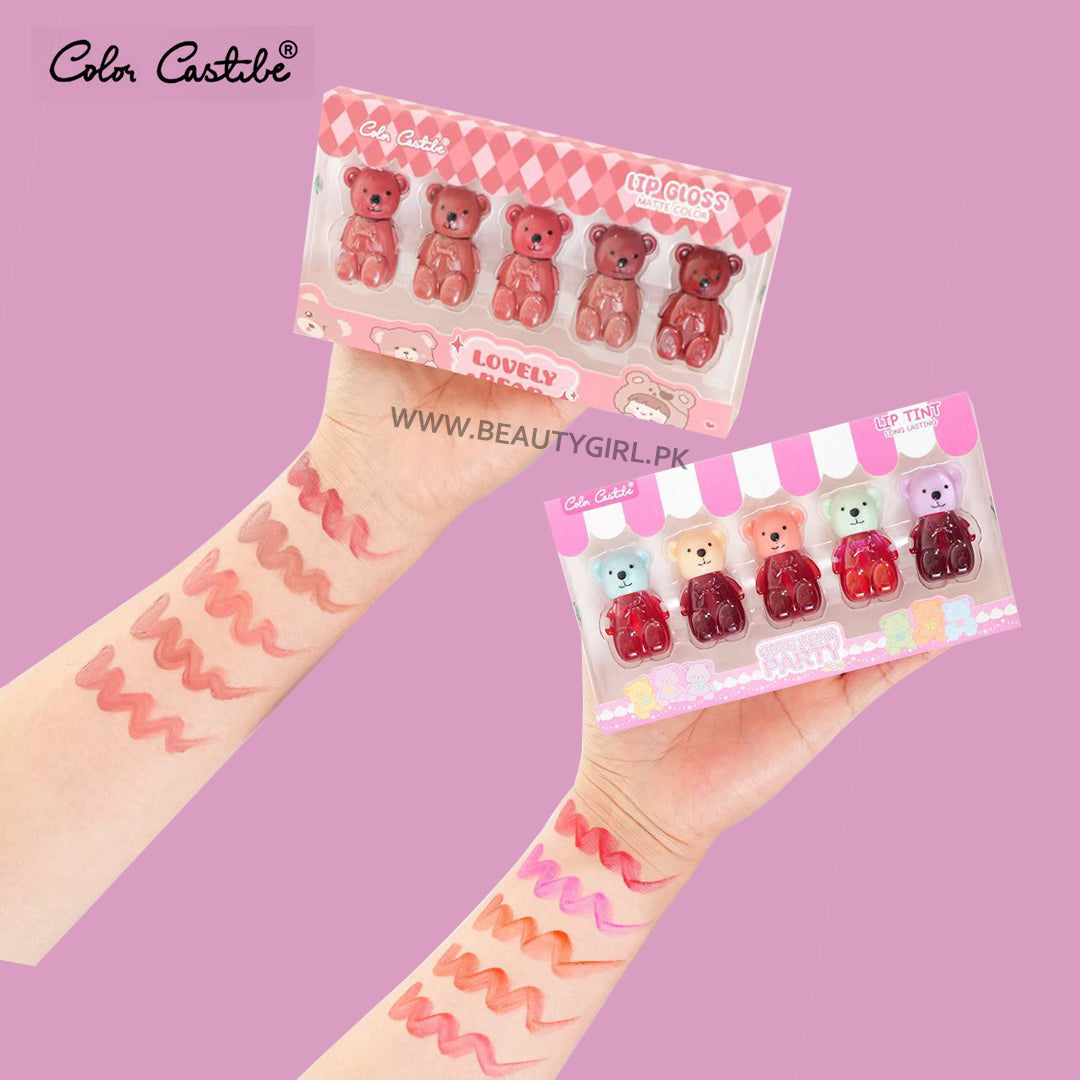 This professional-grade Color Castle Cute Bear set combines a waterproof lip tint with complementary lip gloss for extended wear and versatile styling options. The tint provides long-lasting color that resists fading while the gloss delivers dimension and hydration. Packaged in charming bear-shaped containers, this dual-action set ensures complete lip coverage with a sophisticated finish.