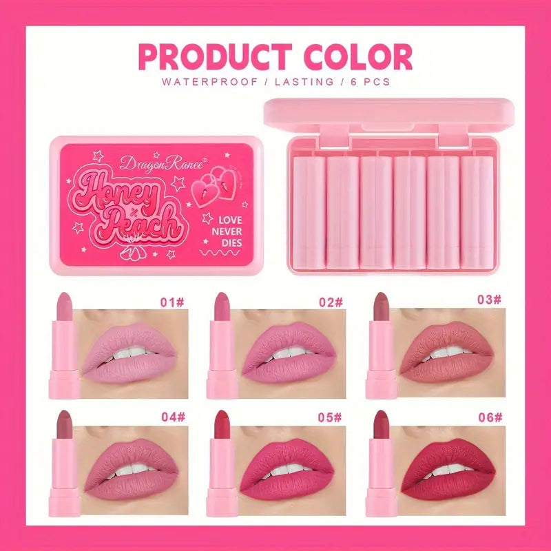 Experience the sweetness of Dragon Ranee Honey Peach Love Never Dies Mini Matte Lipstick Set – a collection of 6 captivating shades packaged in a charming box. These mini matte lipsticks deliver intense color with a velvety finish, ensuring your lips stay beautifully adorned throughout the day. The Honey Peach-inspired hues offer versatility for any occasion, making this set a perfect addition to your makeup collection or a delightful gift. Elevate your lip game with Dragon Ranee's Love Never Dies Mini Matte Lipstick Set, where the allure of honey peach meets the everlasting charm of matte perfection.