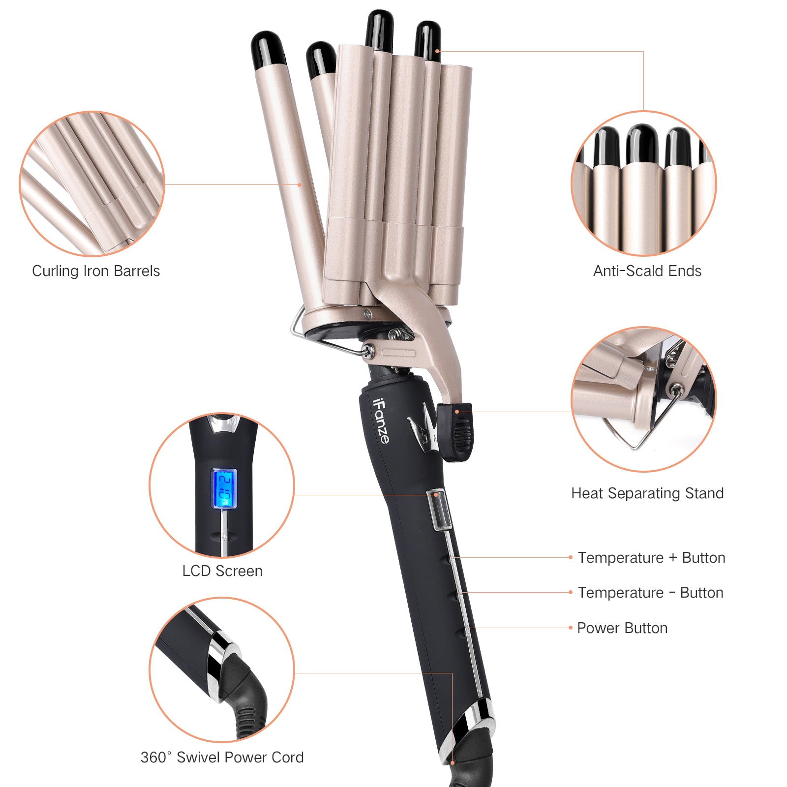 Simple 3 button design 110-240 V Internal Voltage 5-barrel Curling Iron LCD Screen 360 Swivel Cord Stainless steel Stand Premium Heating Materials Curl your hair and leave a striking image at the party with this amazing Amazon Quality iFanze Professional hair curling iron.