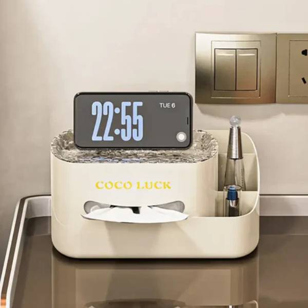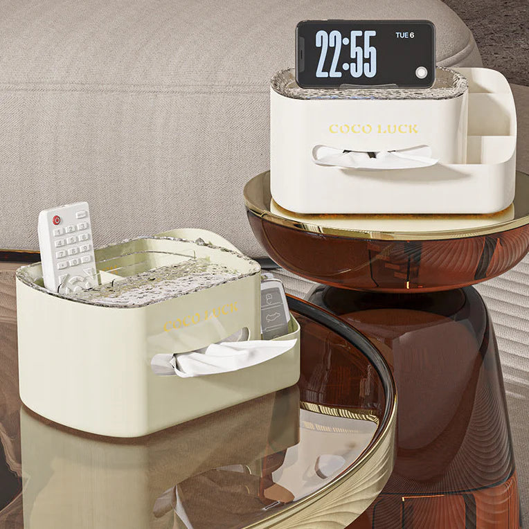 This cosmetic organizer with tissue box is a multifunctional storage solution designed to keep your makeup essentials and daily sundries neatly organised in one stylish unit. Featuring a built-in tissue box holder, this versatile organizer combines practicality with elegance, making it perfect for vanity tables, bathrooms, or desktops. With multiple compartments of varying sizes, it offers ample space to store cosmetics, skincare products, brushes, and accessories, while the top tissue compartment adds convenient access for facial tissues or wipes. Its compact yet spacious design helps reduce clutter, making your beauty routine more efficient and your space more visually appealing.