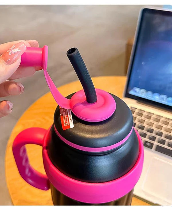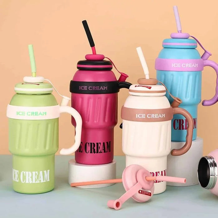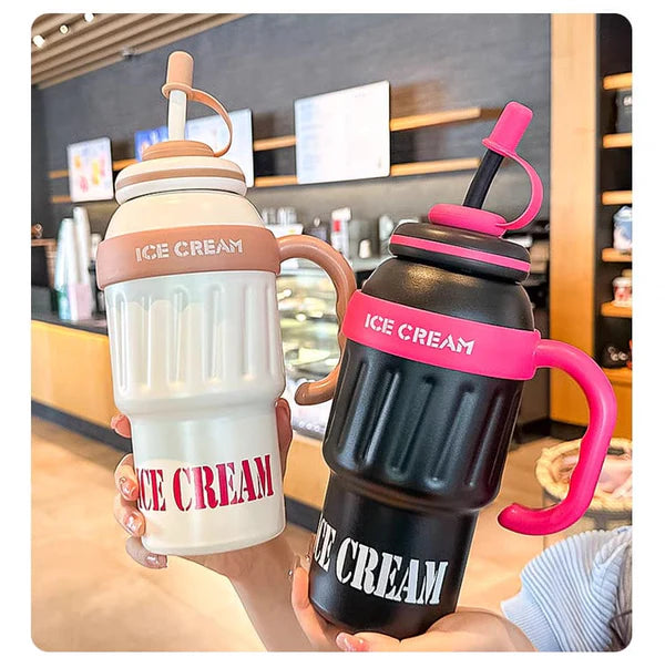 Stainless Steel Cute Ice Cream Tumbler Water Bottle With Straw And Handle 1000ml